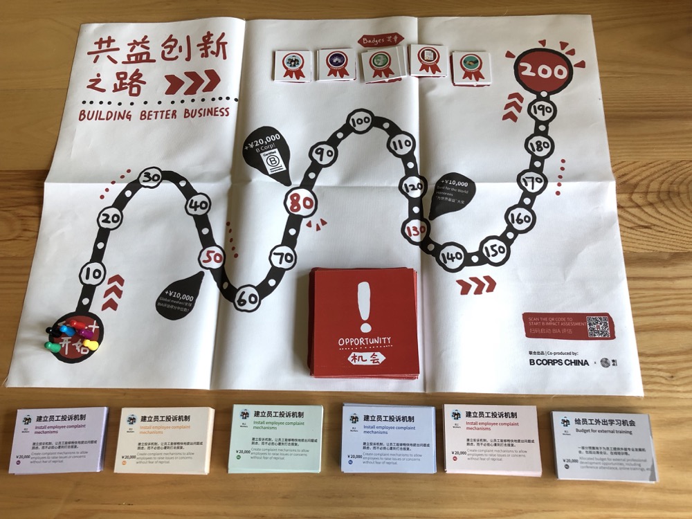 B CorpsTM China Team in partnership with MAKEAPOINT® designed “Building Better Business”Board Game based on B Impact Assessment (BIA) – its evaluation criteria divided into five dimensions including governance, workers, community, environment, and customers – to help more entrepreneurs and companies understand better how taking sustainable measures combined with actions can help their businesses grow.